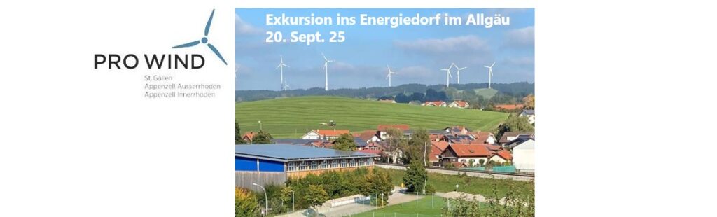 - 20. September 2025 Exkursion ins Energiedorf im AllgäuPro Wind St.Gallen – Appenzell lädt zu einer ganztägigigen Exkursion nach Wildpoldsried ein. Die 2600-Einwohner-Gemeinde im Allgäu gilt als Vorreiterin der Energiewende, da sie seit über 20 Jahren mit innovativen Projekten die Energiewende vor Ort sehr erfolgreich umsetzt. Datum: Samstag, 20. September 2025, Abfahrt: 8:00 Uhr. Die Gemeinde Erstfeld – Energiestadt Gold – wird am Nachmittag zusammen mit… 20. September 2025 Exkursion ins Energiedorf im Allgäu weiterlesen